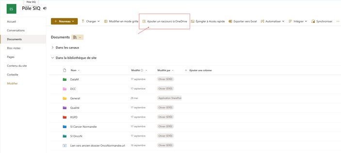 Une fois sur votre SharePoint vous pouvez ajouter directement un raccourci à votre OneDrive, ce qui ajoutera automatiquement un accès rapide depuis votre PC